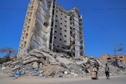 Un palestino camina junto a un edificio destruido por los bombardeos del…