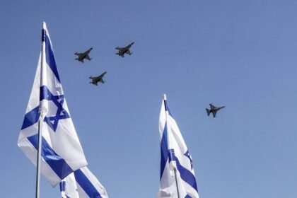Archivo - Aviones de combate de Israel junto a la bandera del…