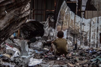 Un niño entre los restos de tiendas de campaña quemadas en la…
