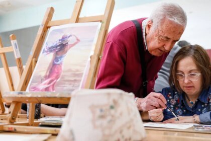 Actividades artísticas para adultos mayores con síndrome de Down en centros de ancianos de Madrid, como pintura y teatro.