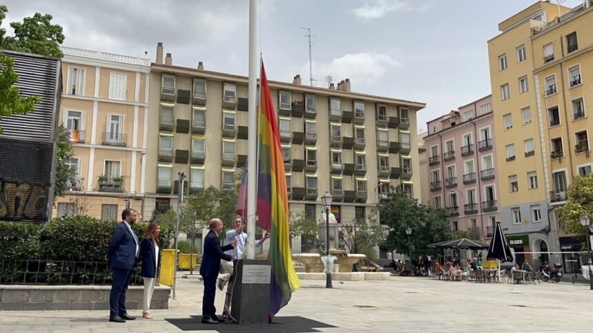 La bandera arcoíris ya ondea en la Plaza Pedro Zerolo de Chueca, llenando de color el corazón del barrio en el Día del Orgullo LGTBI+. La Asociación Diversa Global ha organizado este acto conmemorativo antes del inicio de la programación en Madrid, que comenzará el miércoles con el pregón a cargo de los concursantes de Operación Triunfo 2023, Violeta, Chiara, Juanjo y Martín.