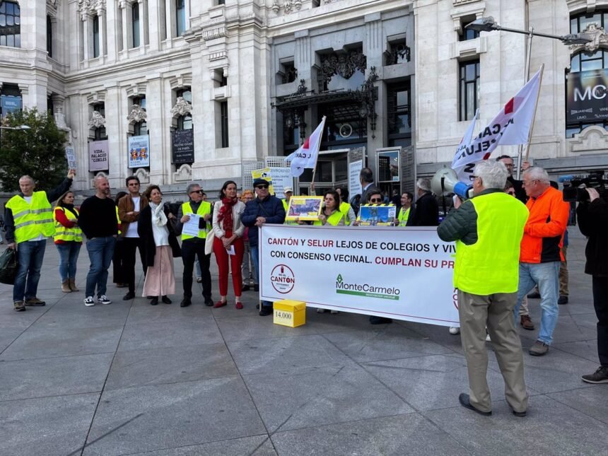 La Asociación Vecinal de Montecarmelo y la Plataforma No al Cantón se han reunido este jueves frente al Palacio de Cibeles, sede del Ayuntamiento de Madrid, después de presentar un total de 14.058 firmas que muestran la oposición ciudadana a la instalación de esta infraestructura.