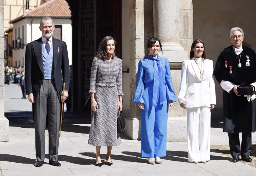 La jornada concluyó con el clásico ‘Gaudeamus igitur’ y se escucharon canciones de la tuna, como en ocasiones anteriores. Además, los Reyes, junto a Sánchez, Urtasun y Ayuso, se tomaron una foto con familiares y amigos de Díez, quienes acompañaron al escritor en este día cervantino.
