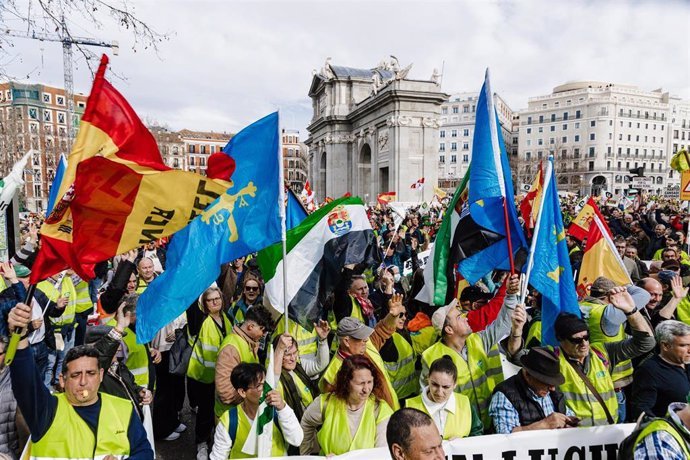 Unos 5.000 manifestantes esperan en el entorno de la Puerta de Alcalá a los tractores que están llegando con retraso al centro de la capital, tras una marcha desde cinco columnas que han arrancado a primera hora de la mañana en Guadalajara y varios municipios de la región.