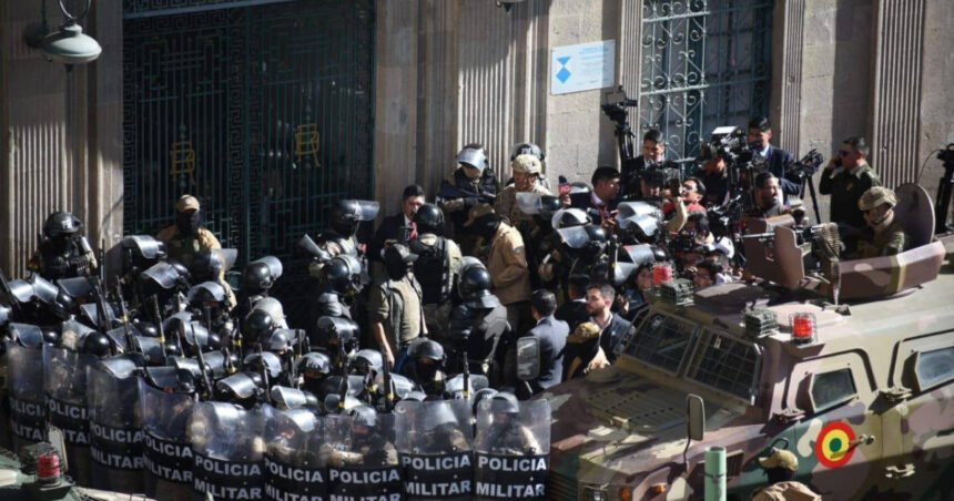 Un tanque derribó la puerta de la Casa Grande del Pueblo, la sede del Gobierno en La Paz, donde Zúñiga y un grupo militar ingresaron por siete minutos y luego se retiraron. «¡Replieguen todas estas fuerzas, es una orden!», le gritó Arce a Zúñiga.