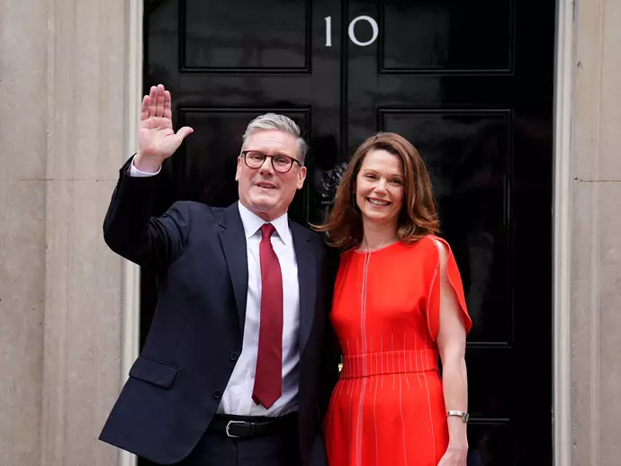 05 July 2024, United Kingdom, London: Newly elected UK Prime Minister Sir Keir Starmer stands with his wife Victoria Starmer at his official London residence at No 10 Downing Street for the first time after the Labour party won a landslide victory at – James Manning/PA Wire/dpa