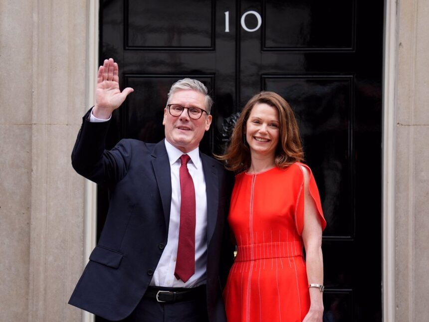 05 July 2024, United Kingdom, London: Newly elected UK Prime Minister Sir Keir Starmer stands with his wife Victoria Starmer at his official London residence at No 10 Downing Street for…