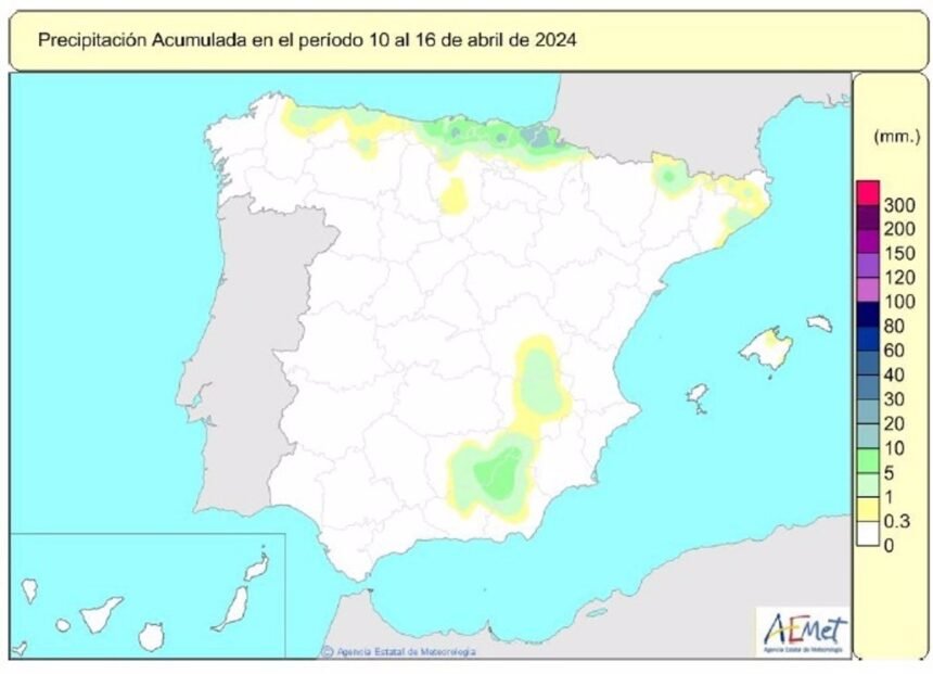 Según la Agencia Estatal de Meteorología (AEMET), el acumulado de lluvias en España desde el inicio del año hidrológico, el 1 de octubre de 2023, hasta el 16 de abril de 2024, ha sido un 10% superior al valor normal para este periodo. A pesar de que las precipitaciones entre el 10 y el 16 de abril fueron escasas, se ha mantenido esta tendencia de superar la media histórica.